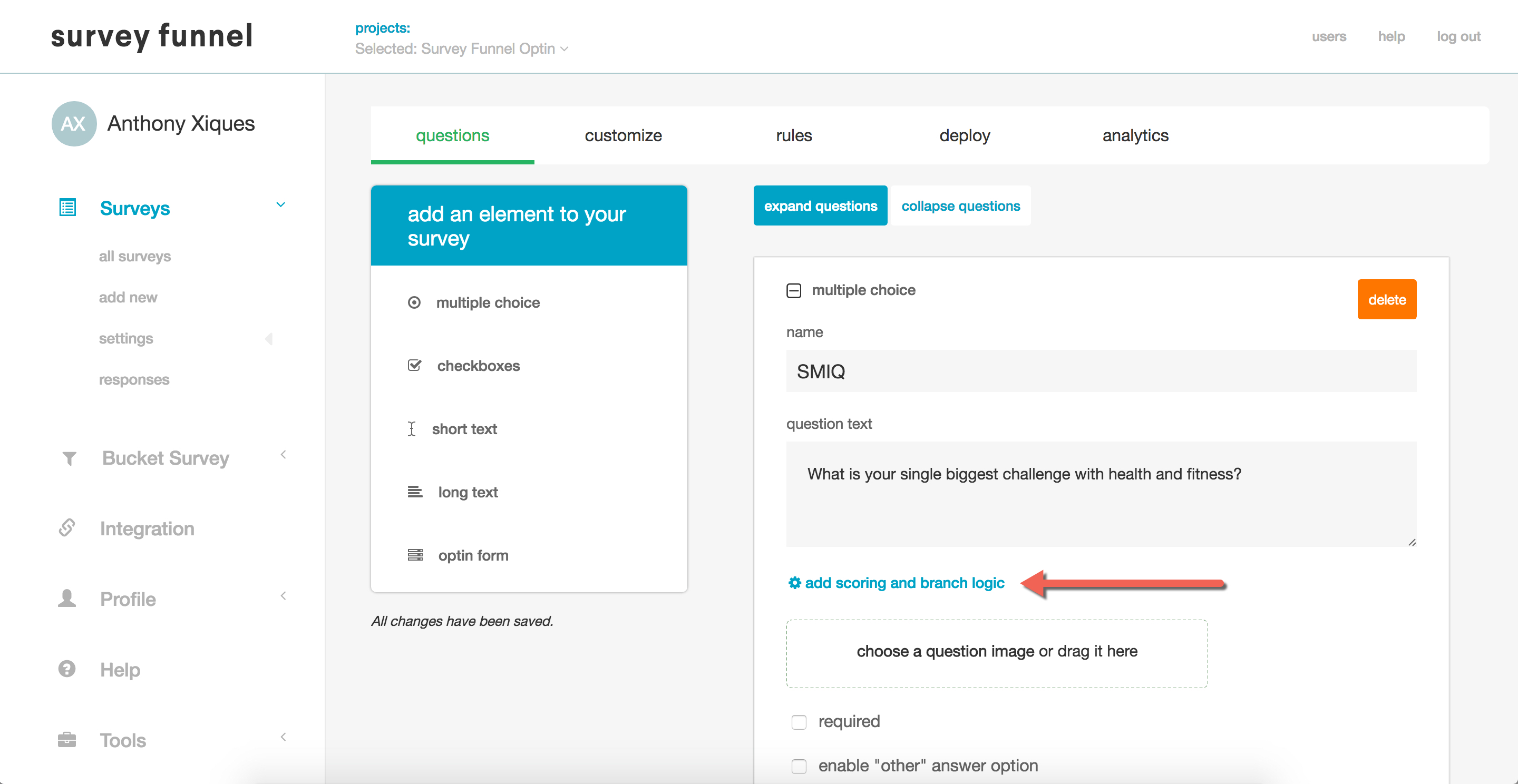 To get started with Branch Logic, switch to the Questions tab and make sure that you have at least three questions added to your survey, and that at least one of those questions is a multiple-choice question.
