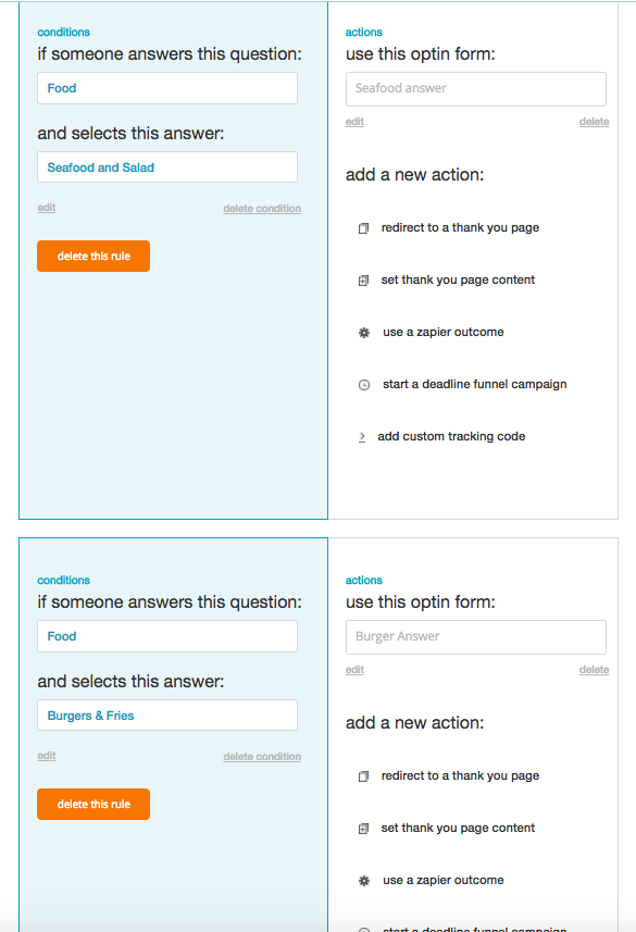 - Now there are 2 rules that integrate with different optin forms based on the answer to the 'Food' question: