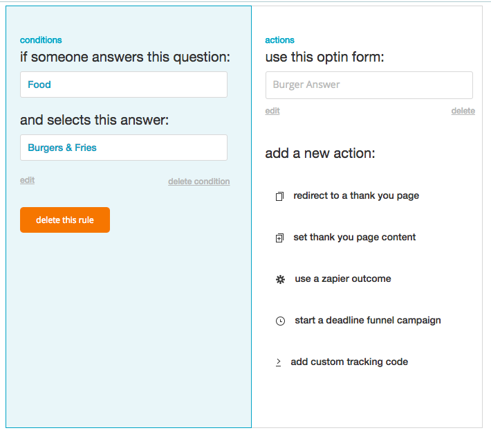 - Now when your survey taker answers the 'food' question with the answer, 'Burgers & Fries', they will be added to that Burger answer optin form: