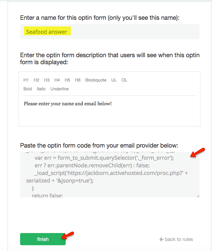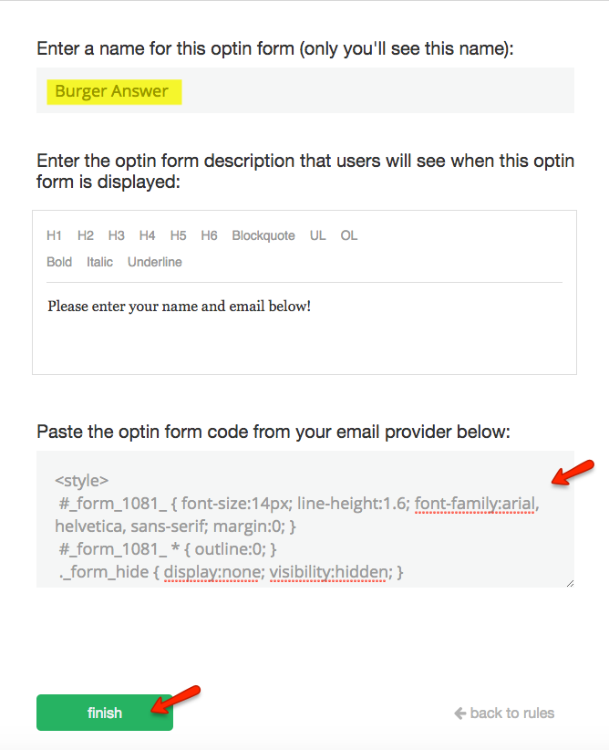 - Add a name for the optin form and the text you want survey takers to see, then paste the HTML optin form code from your email service provider into the box: