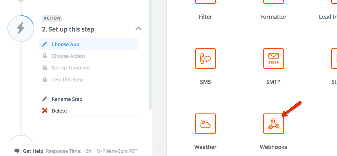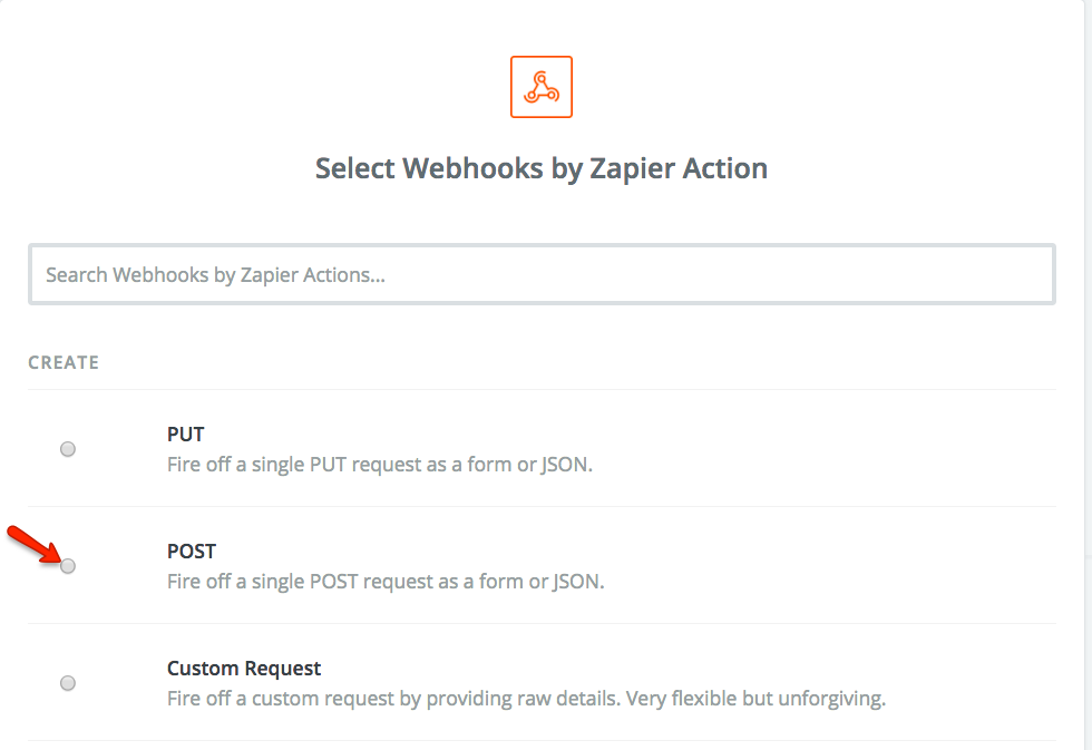 - Select POST (fire off a single POST request as a form or JSON) for the Webhooks by Zapier Action then click 'Save + Continue':
