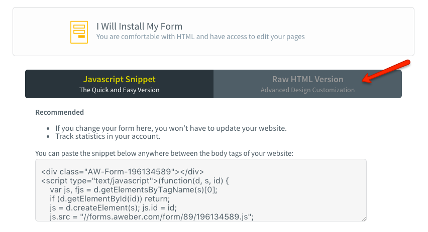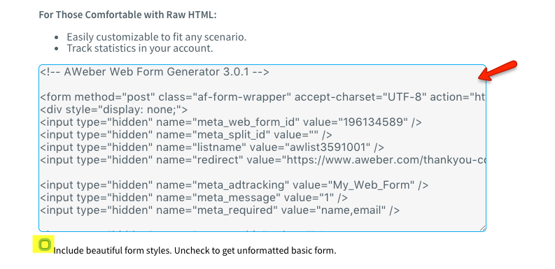 - Uncheck the box labeled, 'Include beautiful form styles' and select and copy the entire HTML form code into a text editor: