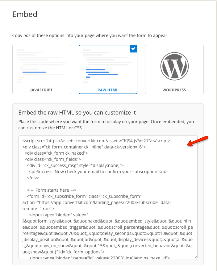 - Select 'RAW HTML' and copy the form code to a text editor: