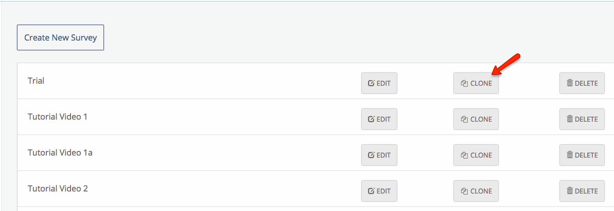 - Select the Survey you want to duplicate and click the 'Clone' button:
