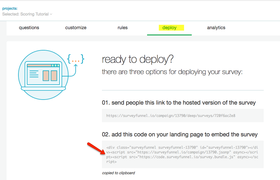 - Navigate to the Deploy tab in Survey Funnel and copy the embed code for the survey you want to embed on Facebook: