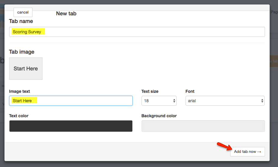 - Edit your tab settings, including giving the tab a name, uploading a tab image, and editing the text, then click 'Add tab now: