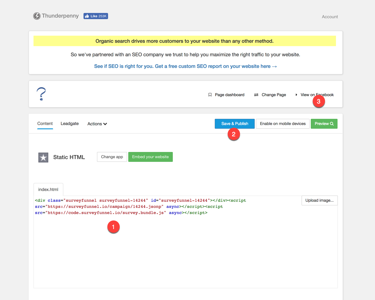 - Paste the Survey Funnel embed code into the index.html box for your Static HTML tab, click 'Save & Publish', then 'View on Facebook':