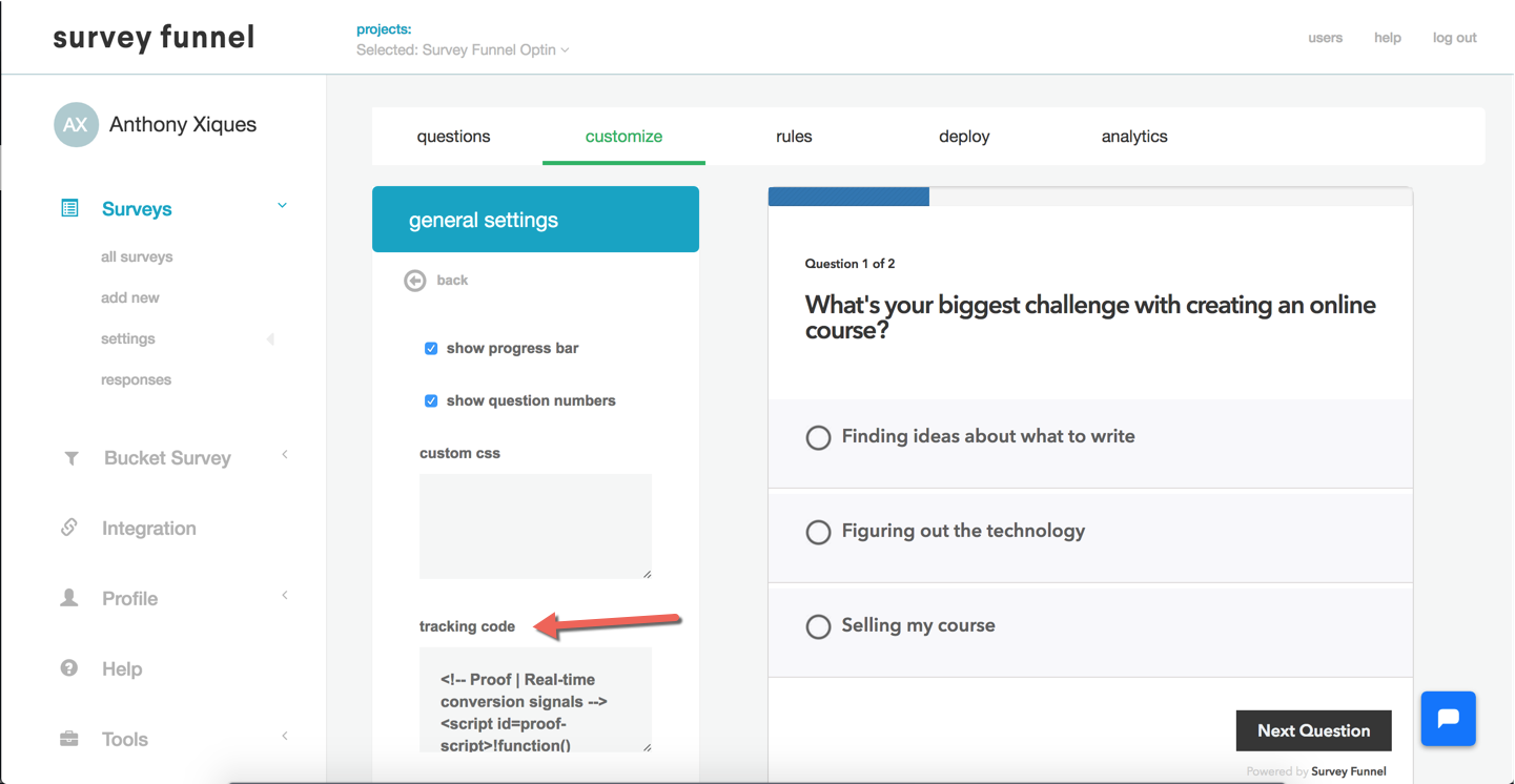 - Add it to Customize >> General Settings >> Tracking Code in Survey Funnel: