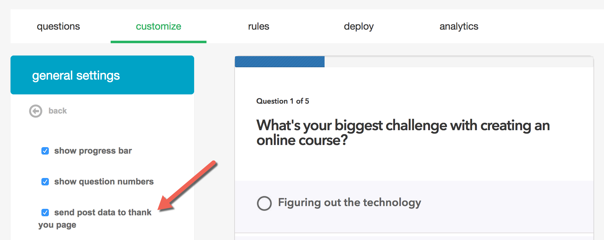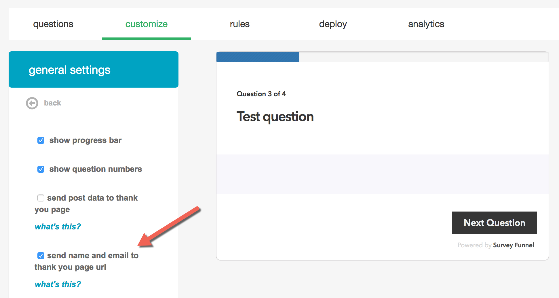 - "Send name and email to thank you page URL" sends the name and email address of the person submitting the survey to your thank you page URL. In order to use this option you need to have an optin form added as an element to your survey, and you also need to set up a thank you page redirect under the Rules tab.